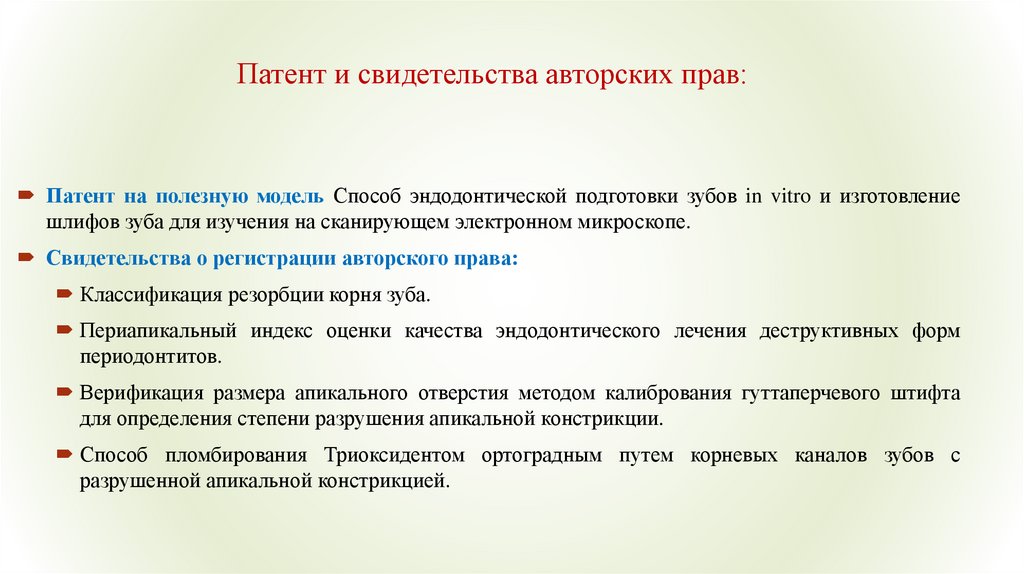 Патент на полезную модель Способ эндодонтической подготовки зубов in vitro и изготовлениешлифов зуба для изучения на сканирующем электронном микроскопе.