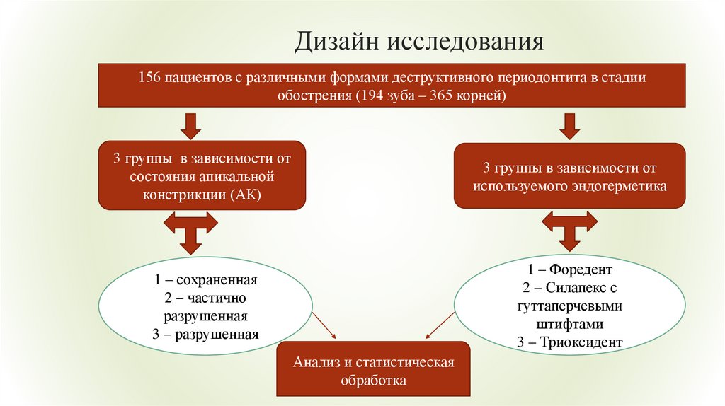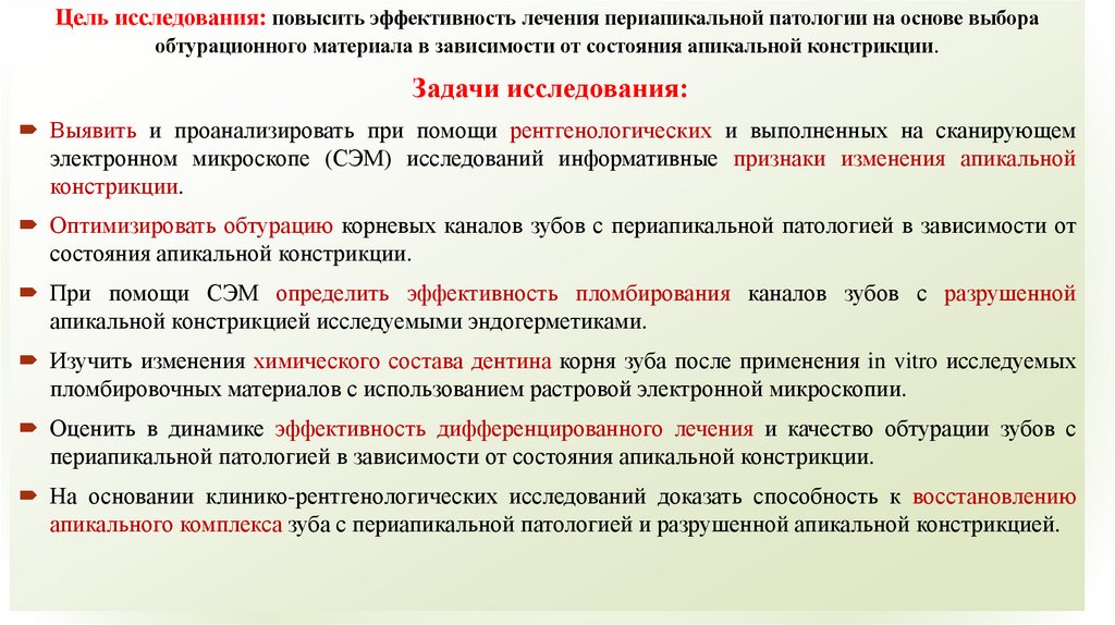 Цель исследования: повысить эффективность лечения периапикальной патологии на основе выбораобтурационного материала в зависимости от состояния апикальной констрикции.