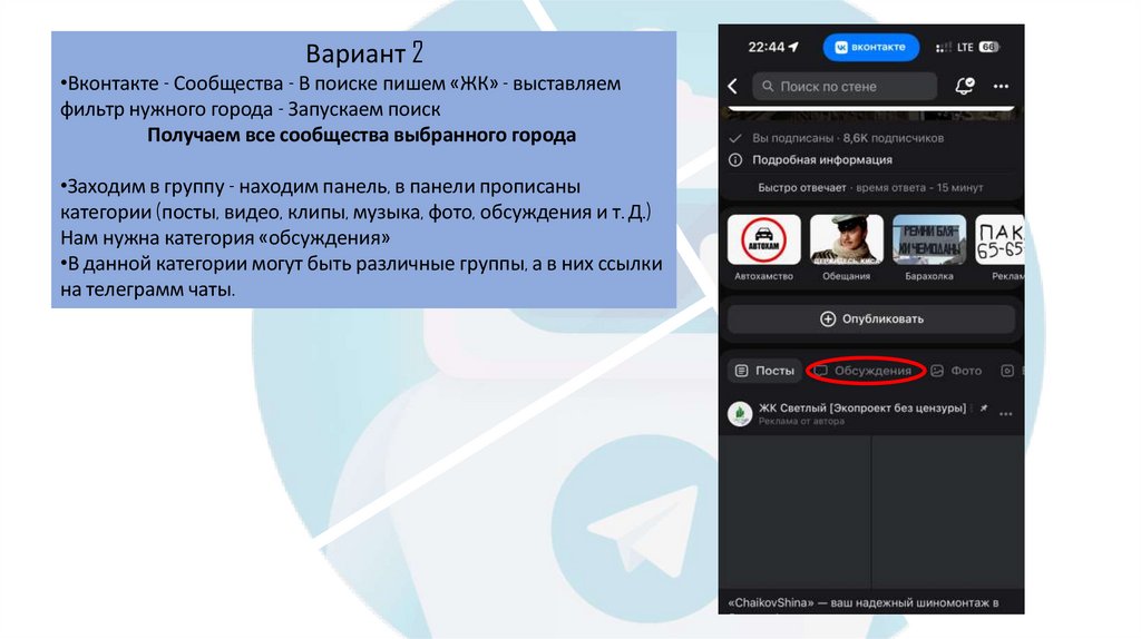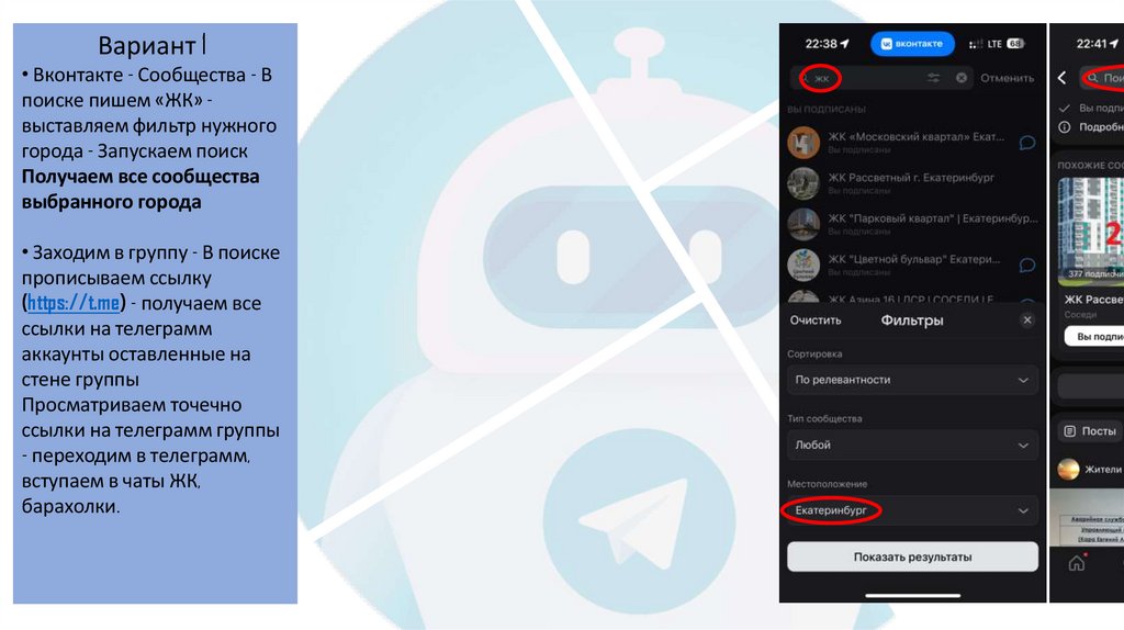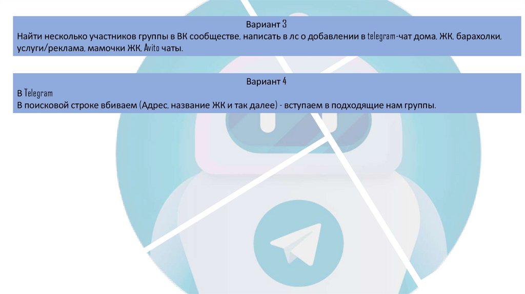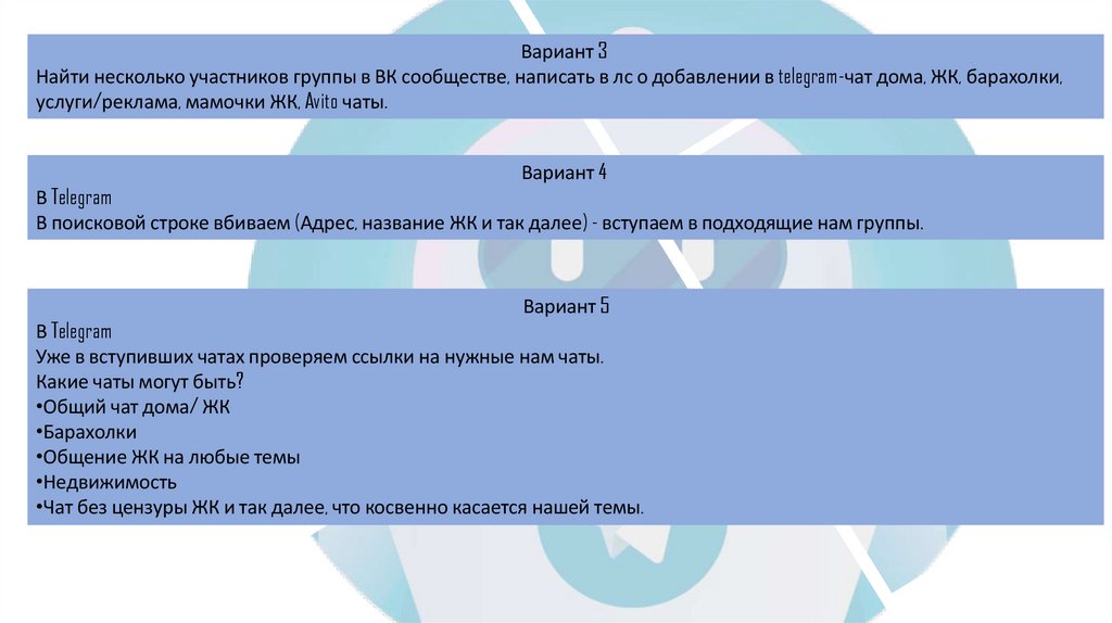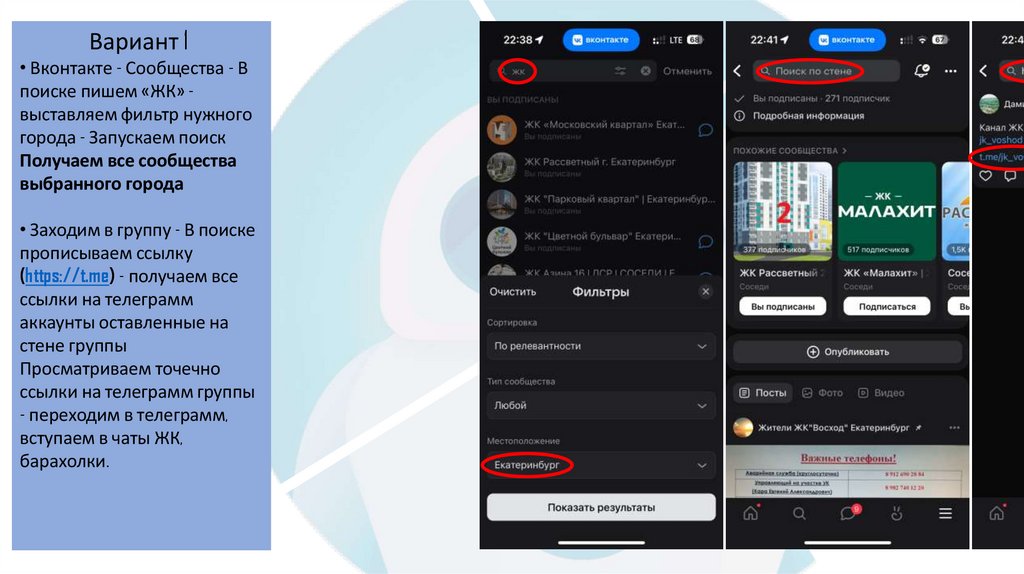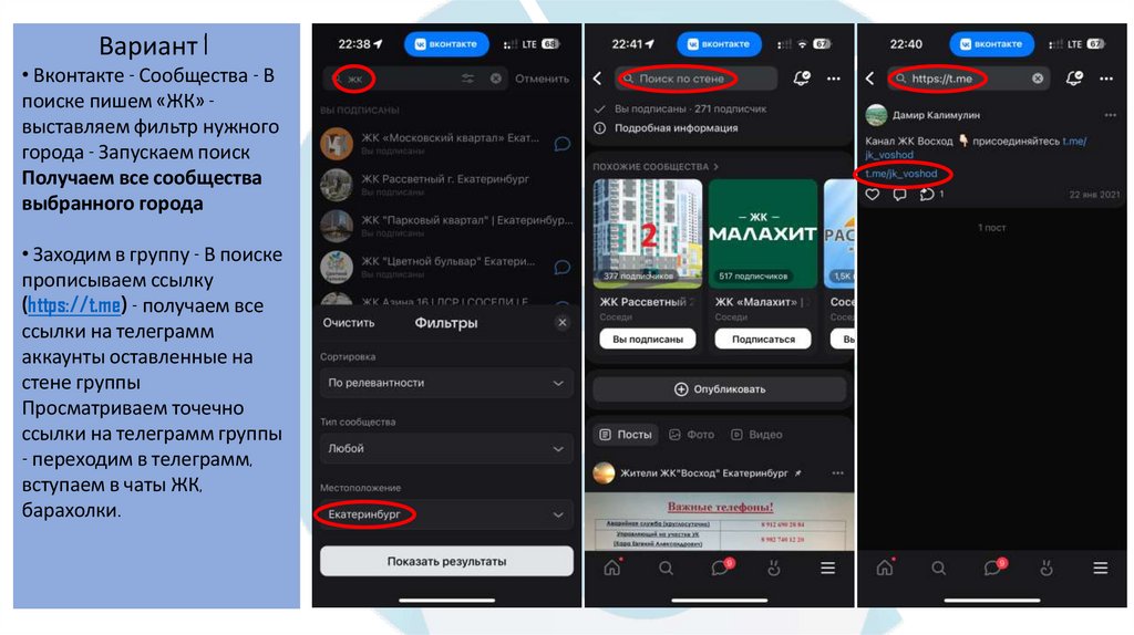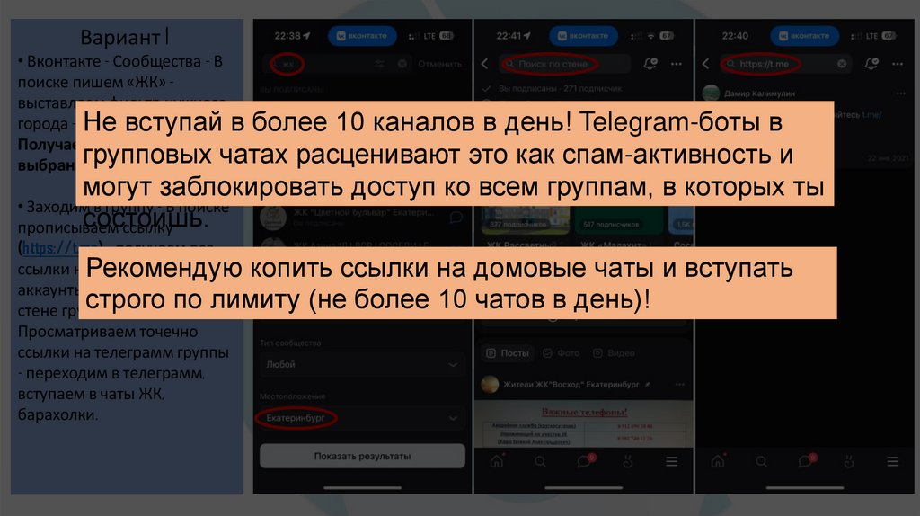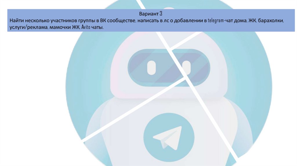 Вариант 3Найти несколько участников группы в ВК сообществе, написать в лс о добавлении в telegram-чат дома, ЖК, барахолки,