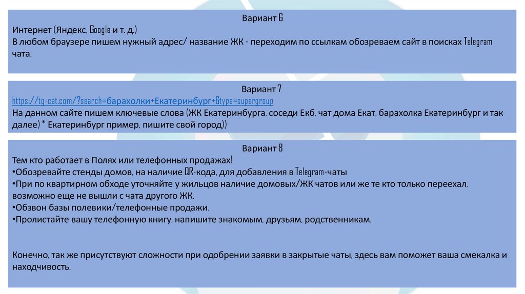 •При по квартирном обходе уточняйте у жильцов наличие домовых/ЖК чатов или же те кто только переехал,