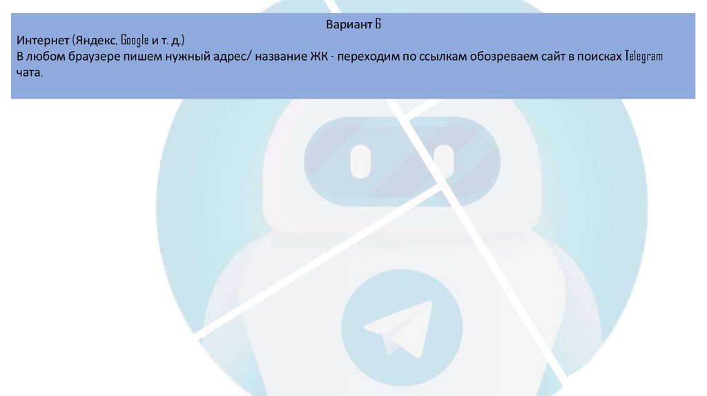 В любом браузере пишем нужный адрес/ название ЖК - переходим по ссылкам обозреваем сайт в поисках Telegram
