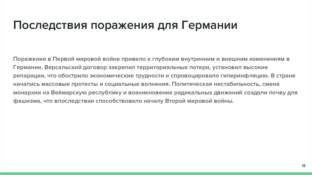 Последствия поражения для ГерманииПоражение в Первой мировой войне привело к глубоким внутренним и внешним изменениям в