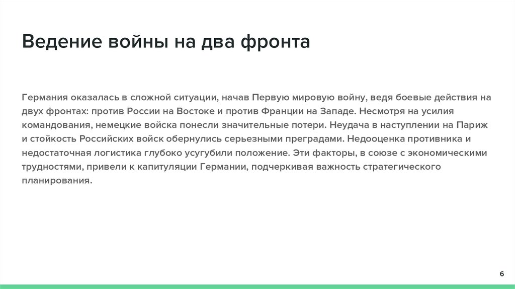 Ведение войны на два фронтаГермания оказалась в сложной ситуации, начав Первую мировую войну, ведя боевые действия на