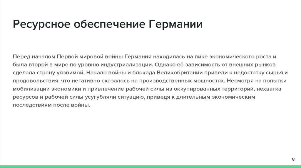 Ресурсное обеспечение ГерманииПеред началом Первой мировой войны Германия находилась на пике экономического роста и