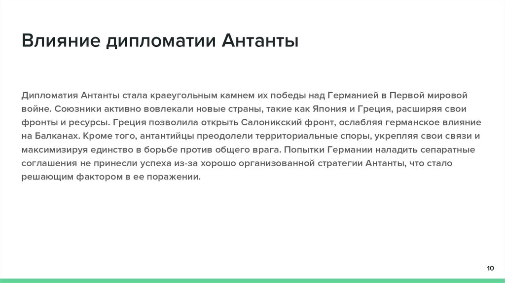 Влияние дипломатии АнтантыДипломатия Антанты стала краеугольным камнем их победы над Германией в Первой мировой
