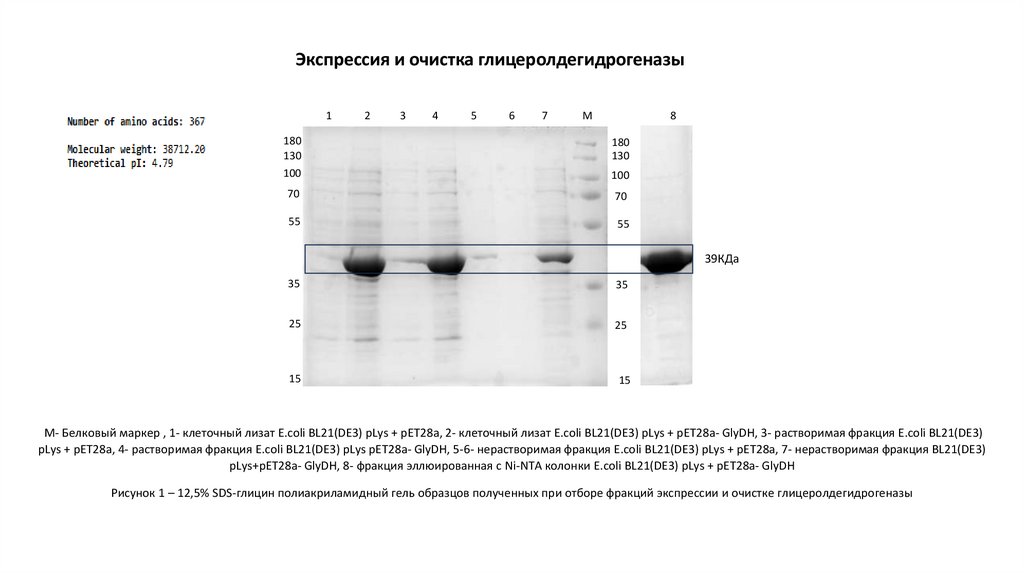 pLys+pET28a- GlyDH, 8- фракция эллюированная с Ni-NTA колонки E.coli BL21(DE3) pLys + pET28a- GlyDH