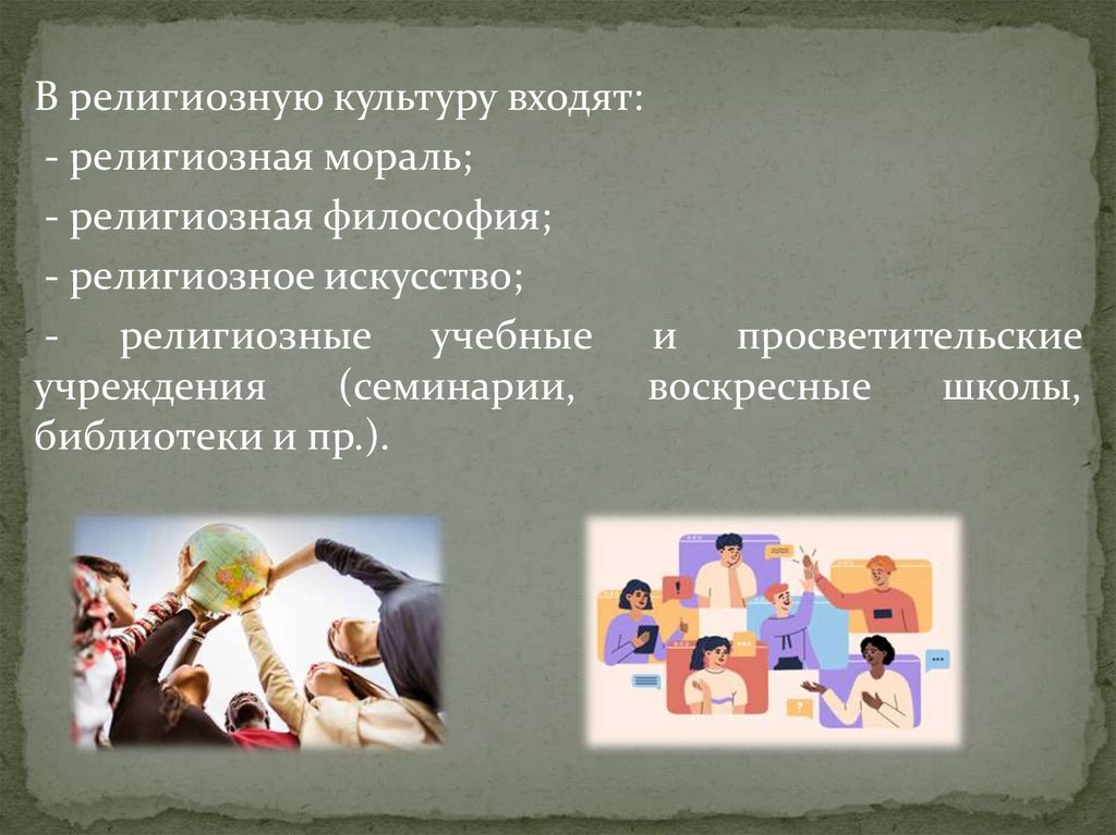 Религиозная культура - это составная часть общейкультуры, сформированная из религиозных запросов