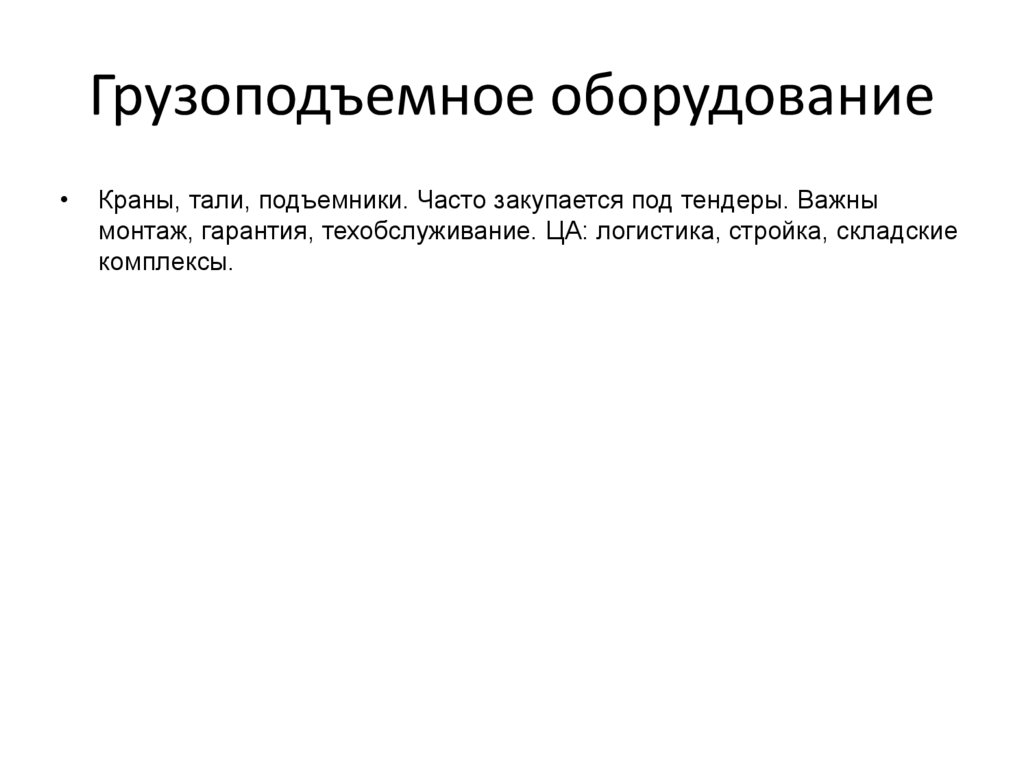 Грузоподъемное оборудованиеКраны, тали, подъемники. Часто закупается под тендеры. Важны