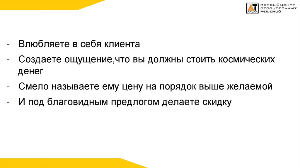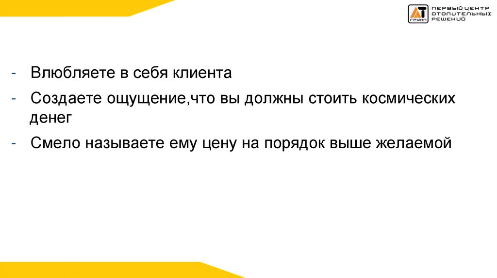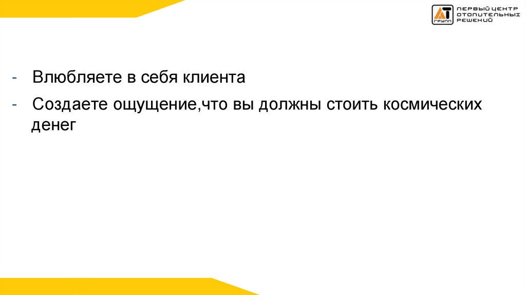 - Влюбляете в себя клиента- Создаете ощущение,что вы должны стоить космических