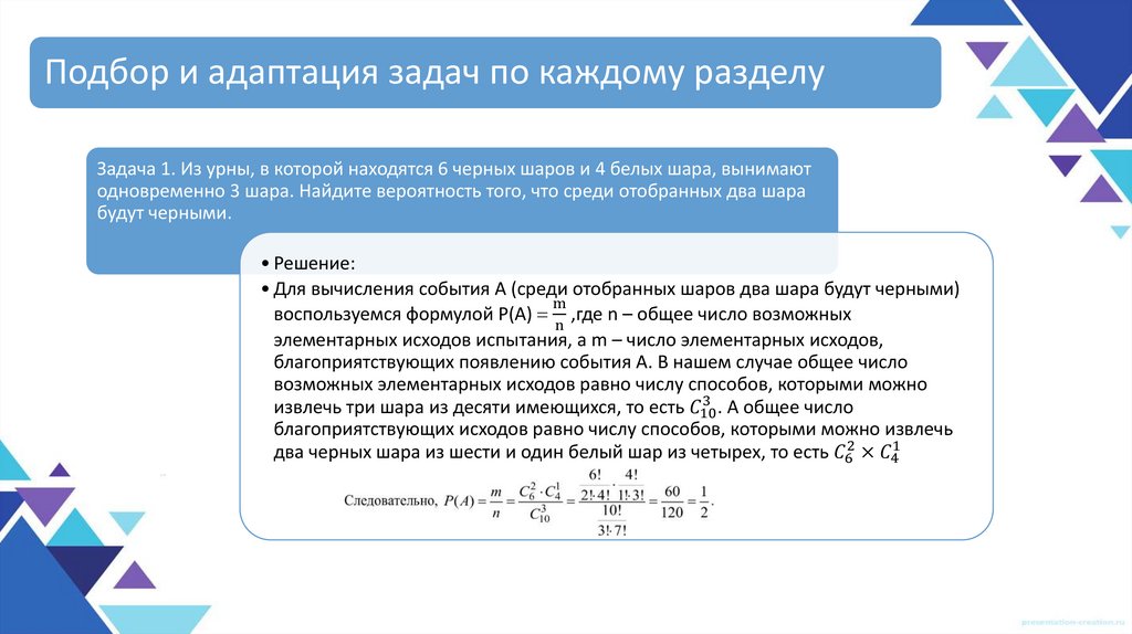 Подбор и адаптация задач по каждому разделуЗадача 1. Из урны, в которой находятся 6 черных шаров и 4 белых шара, вынимают