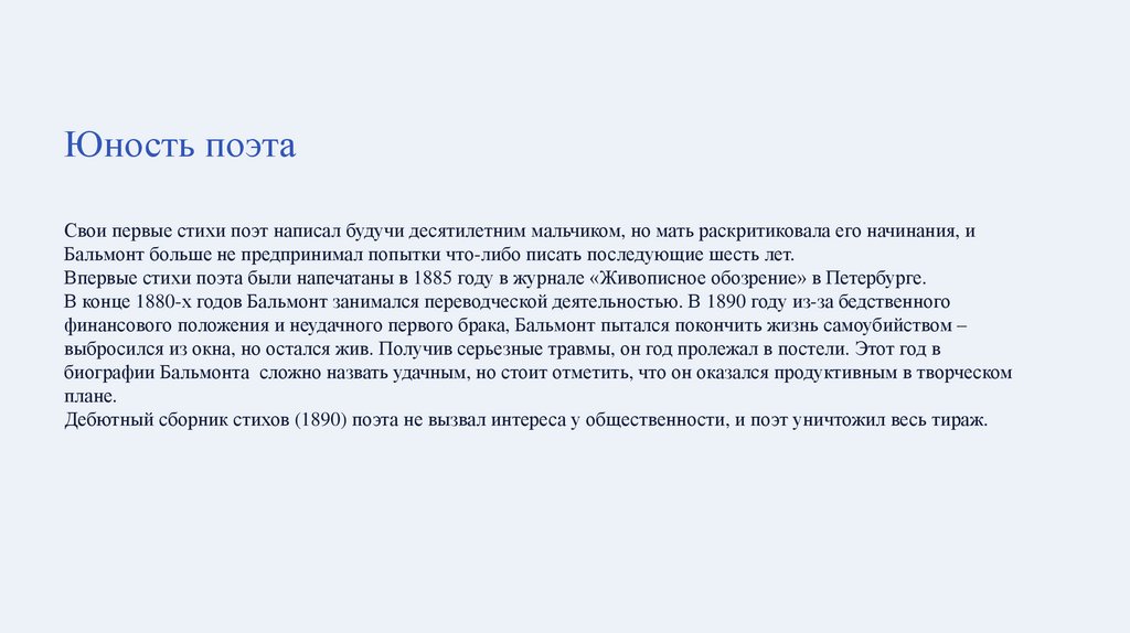 биографии Бальмонта сложно назвать удачным, но стоит отметить, что он оказался продуктивным в творческом