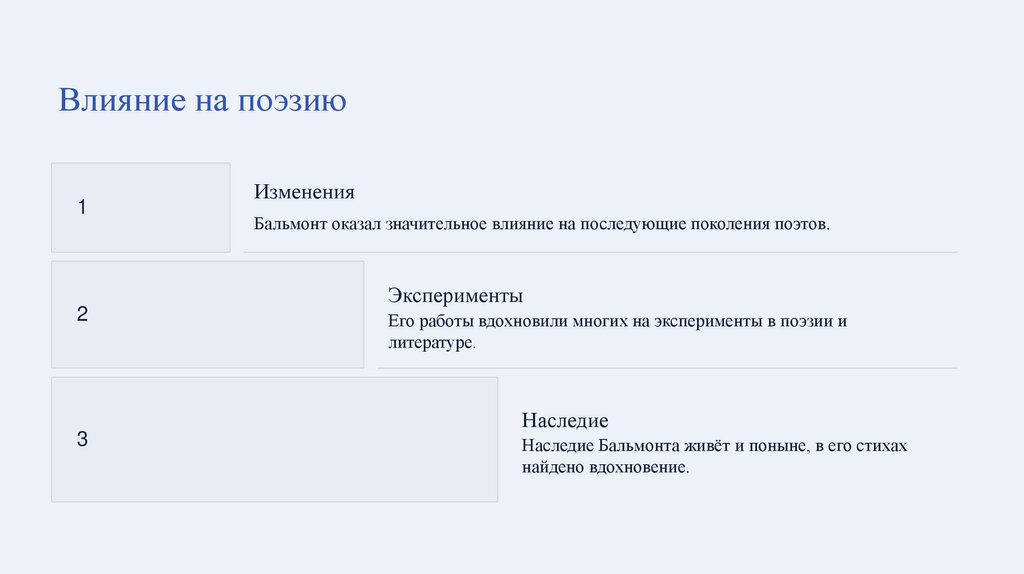 Бальмонт оказал значительное влияние на последующие поколения поэтов.