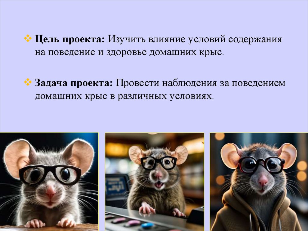 Цель проекта: Изучить влияние условий содержанияна поведение и здоровье домашних крыс.