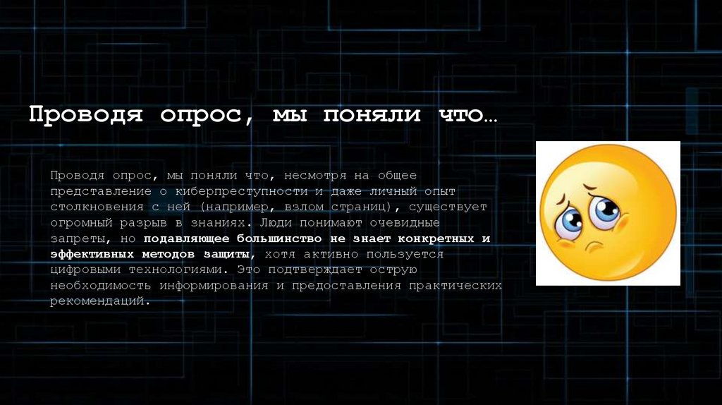 Проводя опрос, мы поняли что, несмотря на общеепредставление о киберпреступности и даже личный опыт