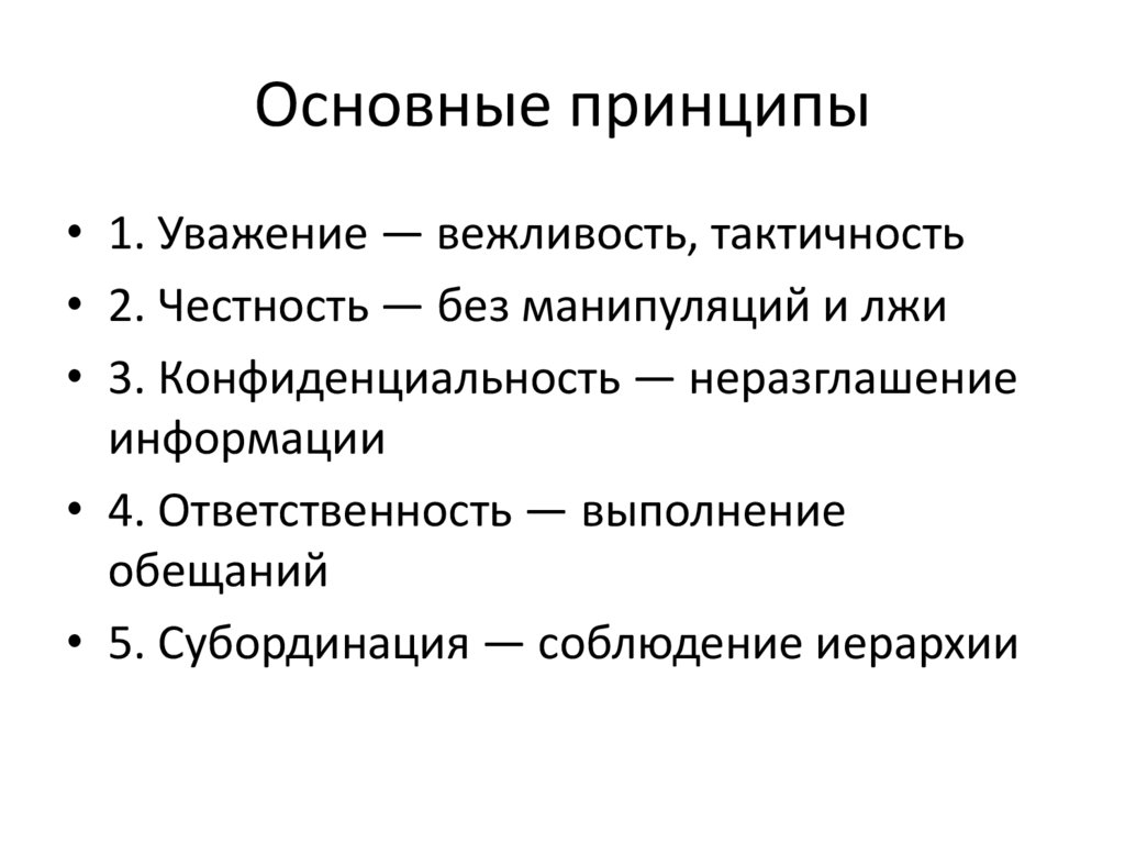 Основные принципы• 1. Уважение — вежливость, тактичность