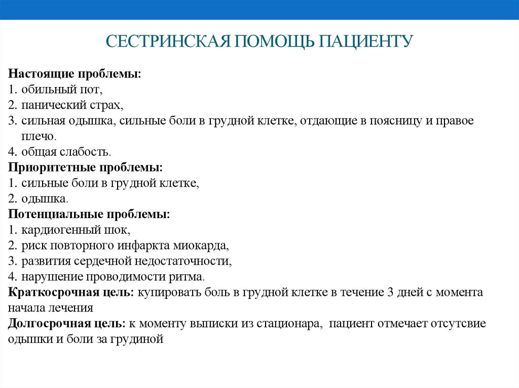 2. Выявить проблемы пациента с заболеванием «инфаркт миокарда в остром периоде»