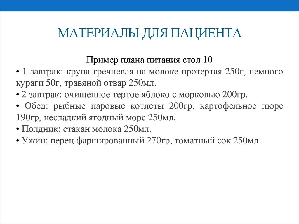 МАТЕРИАЛЫ ДЛЯ ПАЦИЕНТАПример плана питания стол 10