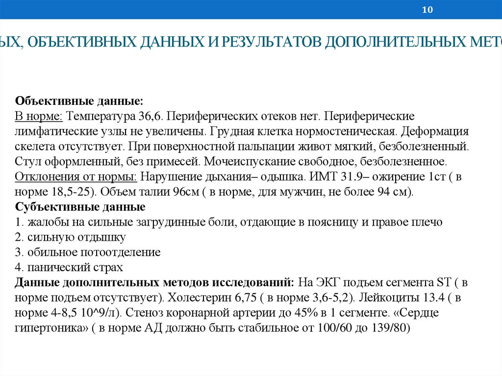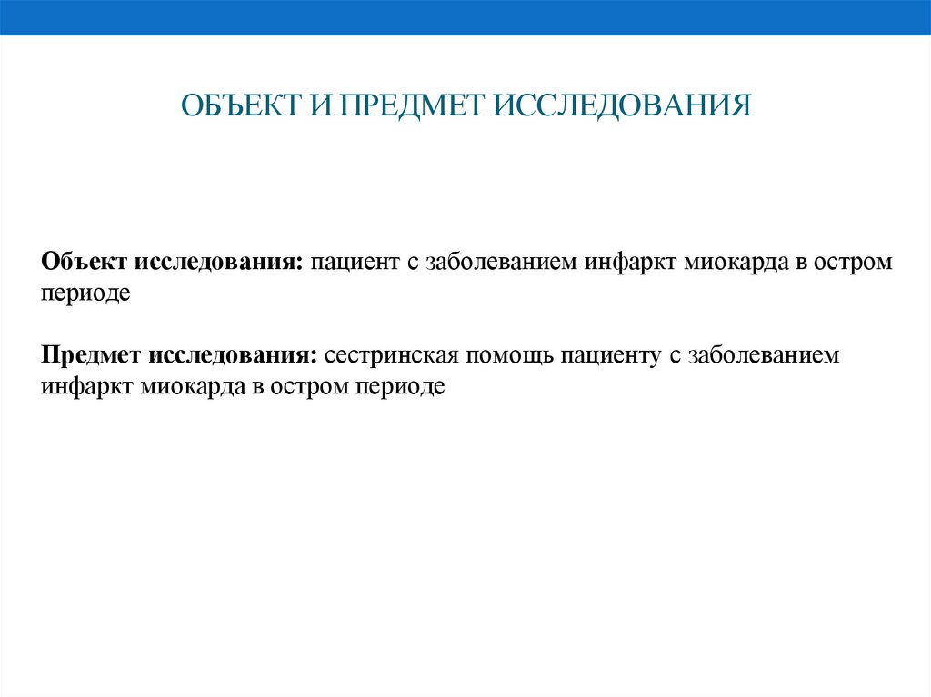ОБЪЕКТ И ПРЕДМЕТ ИССЛЕДОВАНИЯОбъект исследования: пациент с заболеванием инфаркт миокарда в остром