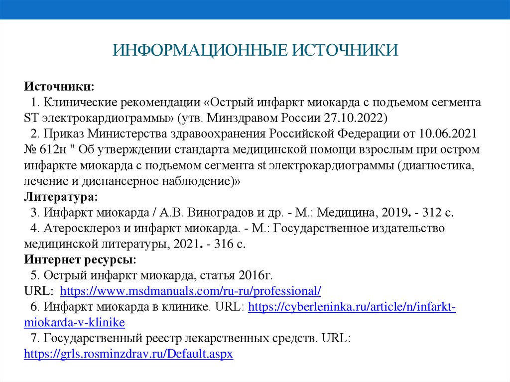 1. Клинические рекомендации «Острый инфаркт миокарда с подъемом сегмента