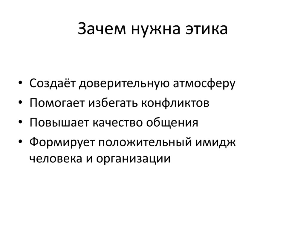 Зачем нужна этика• Создаёт доверительную атмосферу