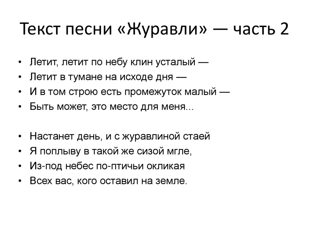 Текст песни «Журавли» — часть 2Летит, летит по небу клин усталый —