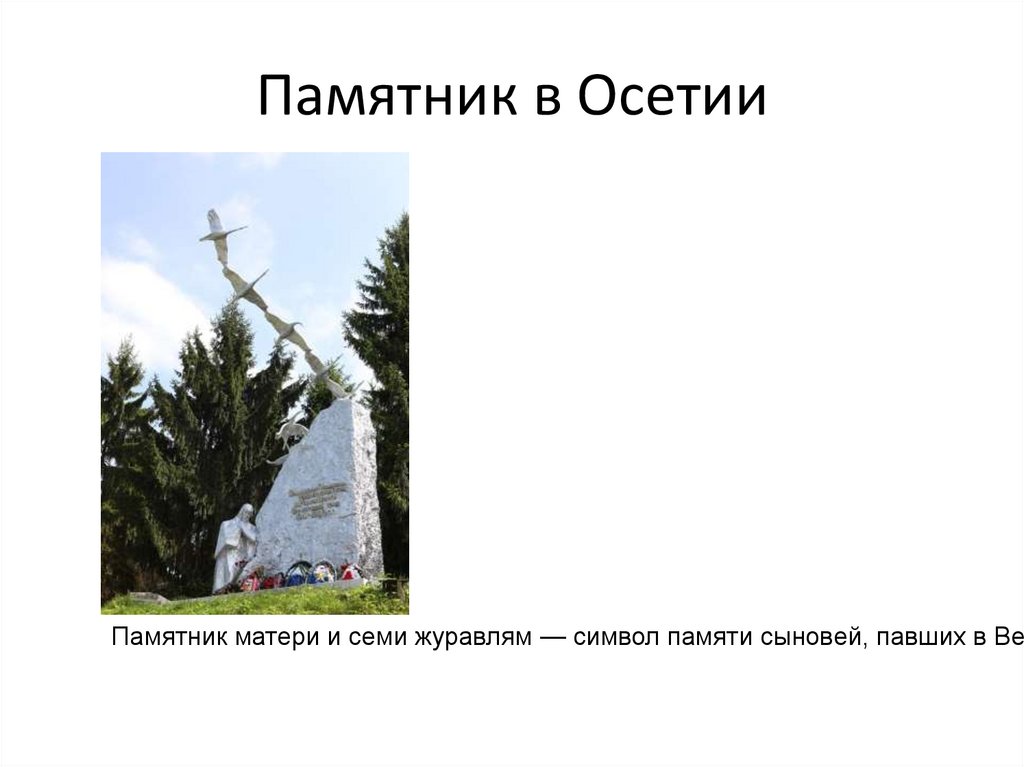 Памятник в ОсетииПамятник матери и семи журавлям — символ памяти сыновей, павших в Вел