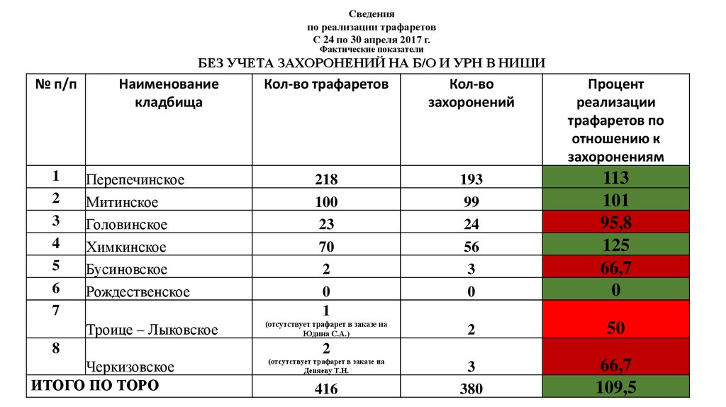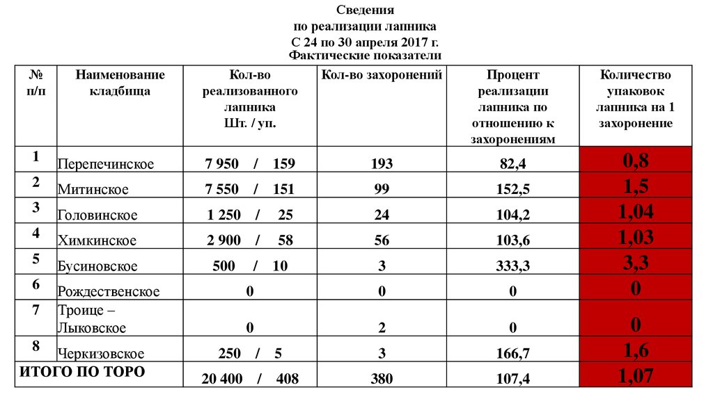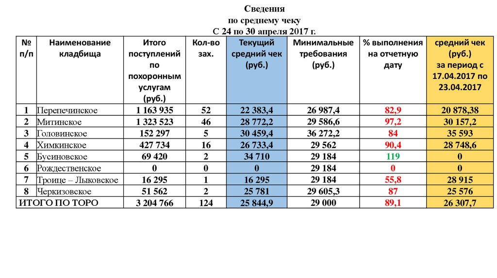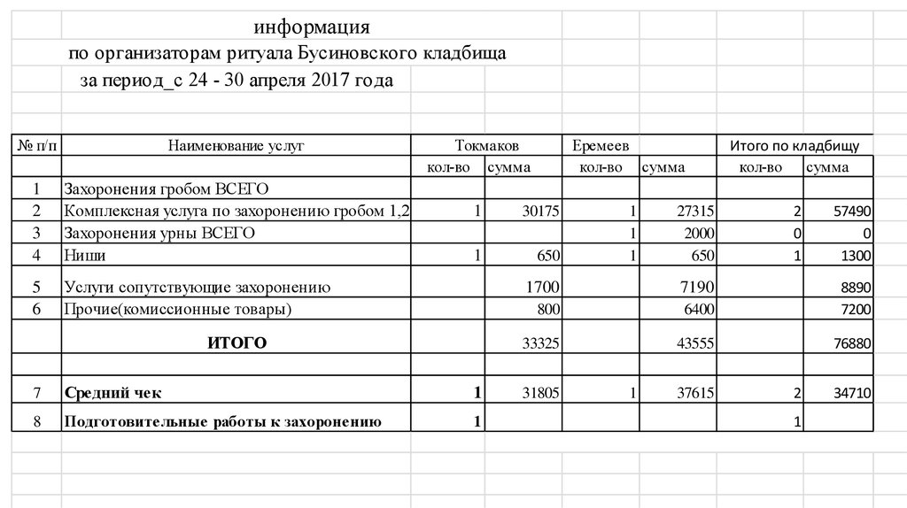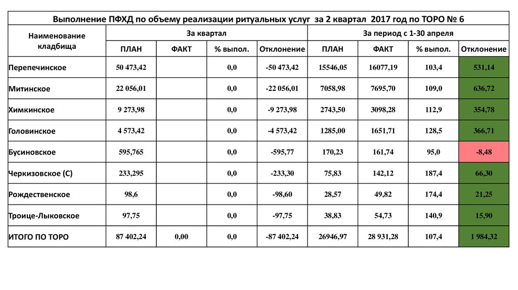 Выполнение ПФХД по объему реализации ритуальных услуг за 2 квартал 2017 год по ТОРО № 6Наименование