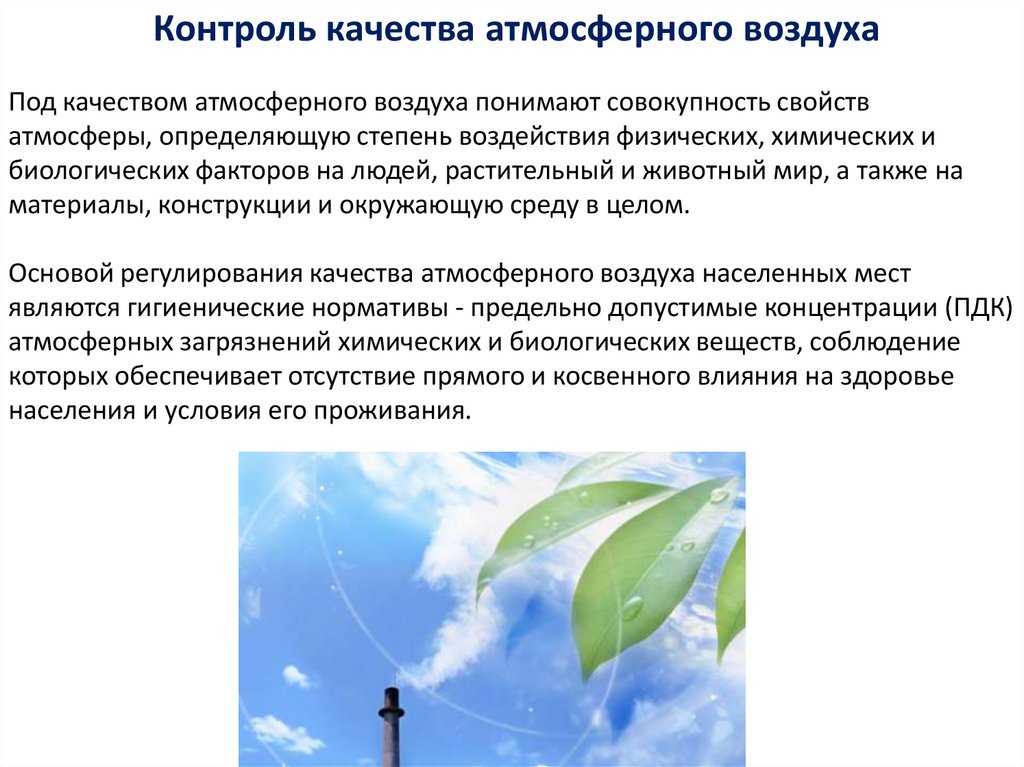 Под качеством атмосферного воздуха понимают совокупность свойстватмосферы, определяющую степень воздействия физических, химических и