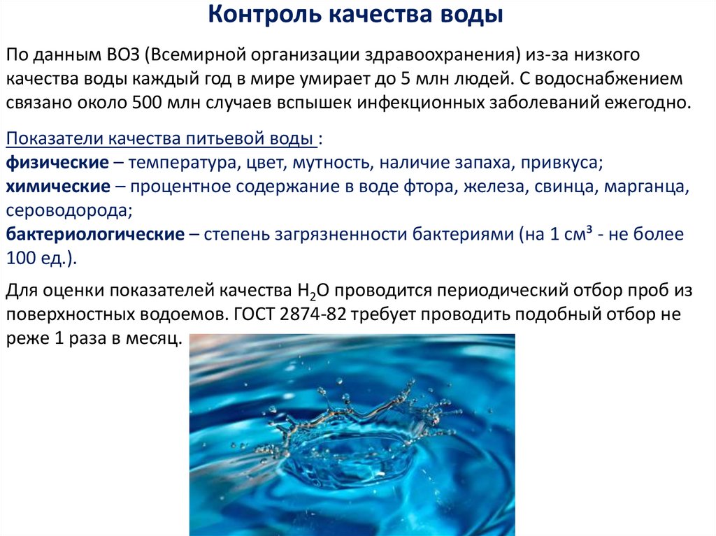химические – процентное содержание в воде фтора, железа, свинца, марганца,