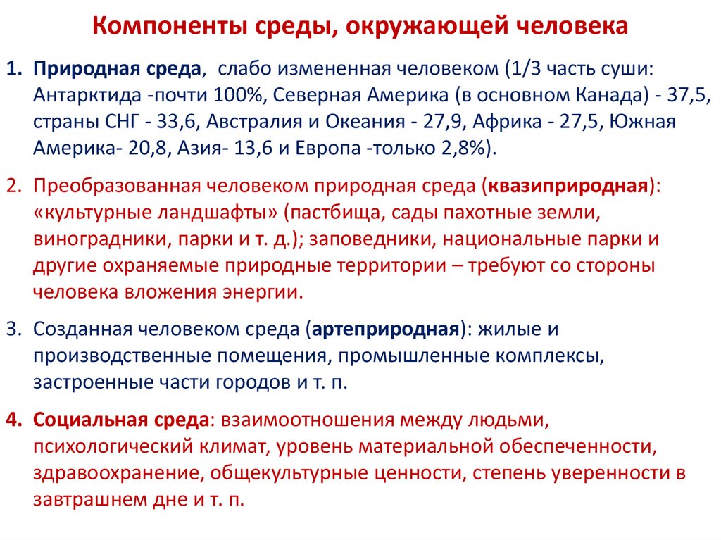 Компоненты среды, окружающей человека1. Природная среда, слабо измененная человеком (1/3 часть суши: