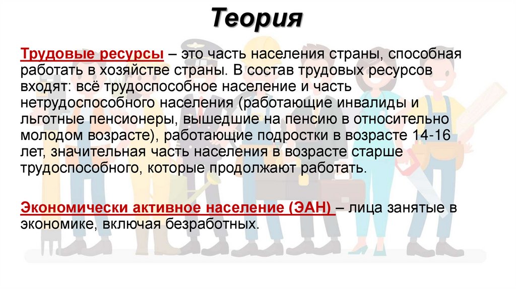 Трудовые ресурсы – это часть населения страны, способнаяработать в хозяйстве страны. В состав трудовых ресурсов