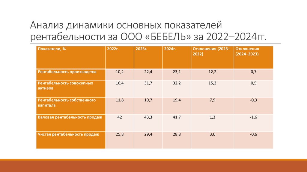 7. Анализ динамики основных показателей рентабельности за ООО «БЕБЕЛЬ» за 2022–2024гг.