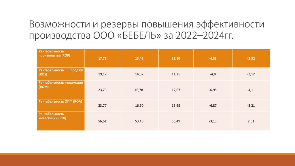 9. Возможности и резервы повышения эффективности производства ООО «БЕБЕЛЬ» за 2022–2024гг.