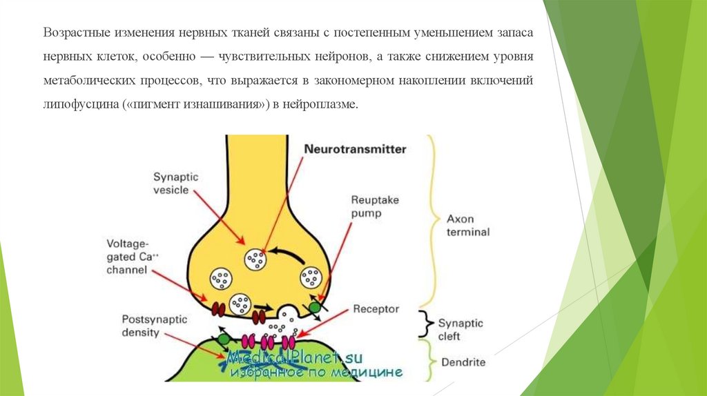 Возрастные изменения нервных тканей связаны с постепенным уменьшением запасанервных клеток, особенно — чувствительных нейронов, а также снижением уровня