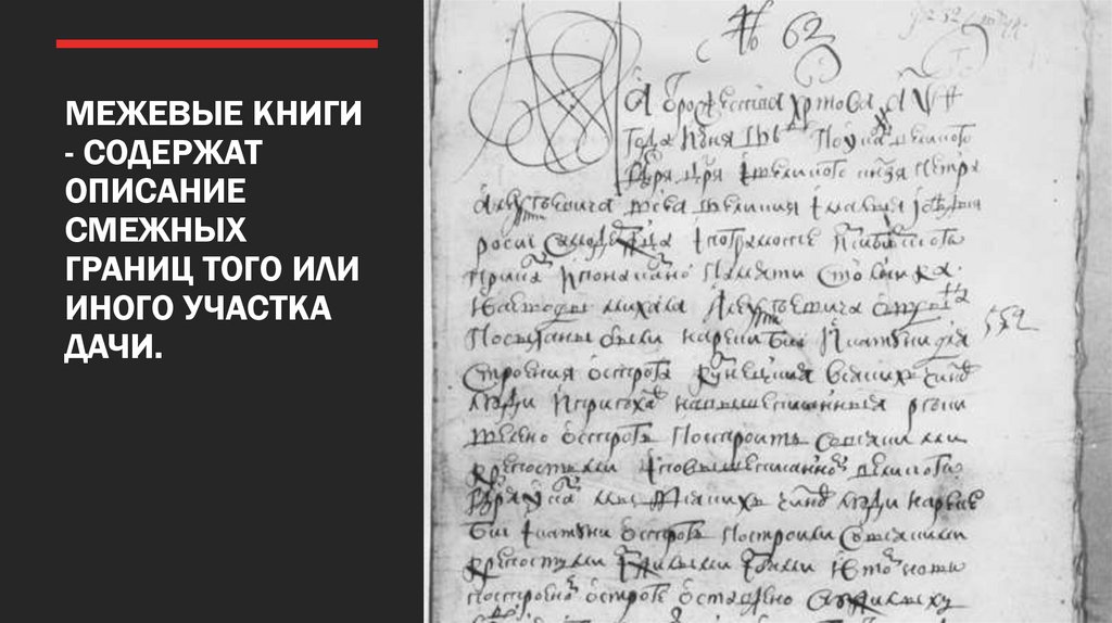 15. Межевые книги - Содержат описание смежных границ того или иного участка дачи.