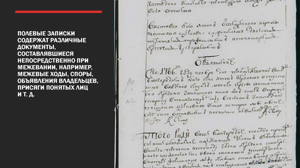 например, межевые ходы, споры, объявления владельцев, присяги понятых лиц) и прочие.