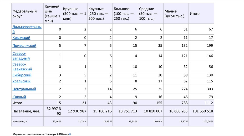 «миллионеры» — с людностью свыше 1 000 000,крупнейшие — от 500 000 до 1 000 000,