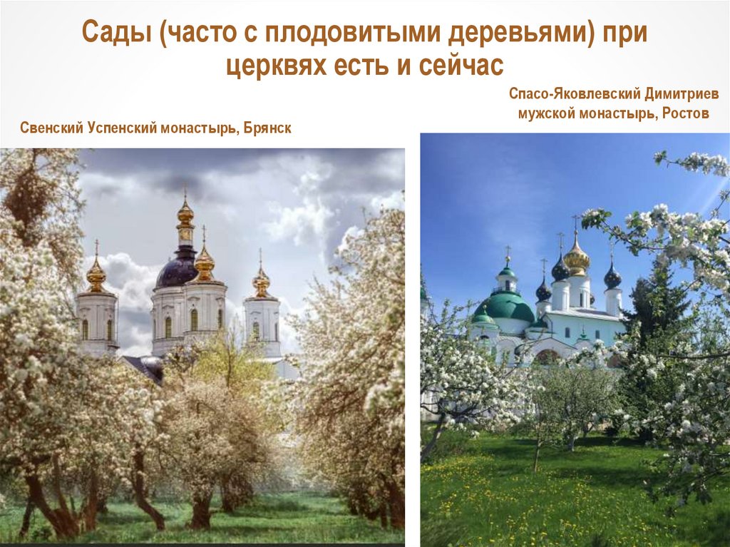 В летописях раннехристианской Руси сохранились сведения оцерковных и монастырских садах-огородах. Церковные сады
