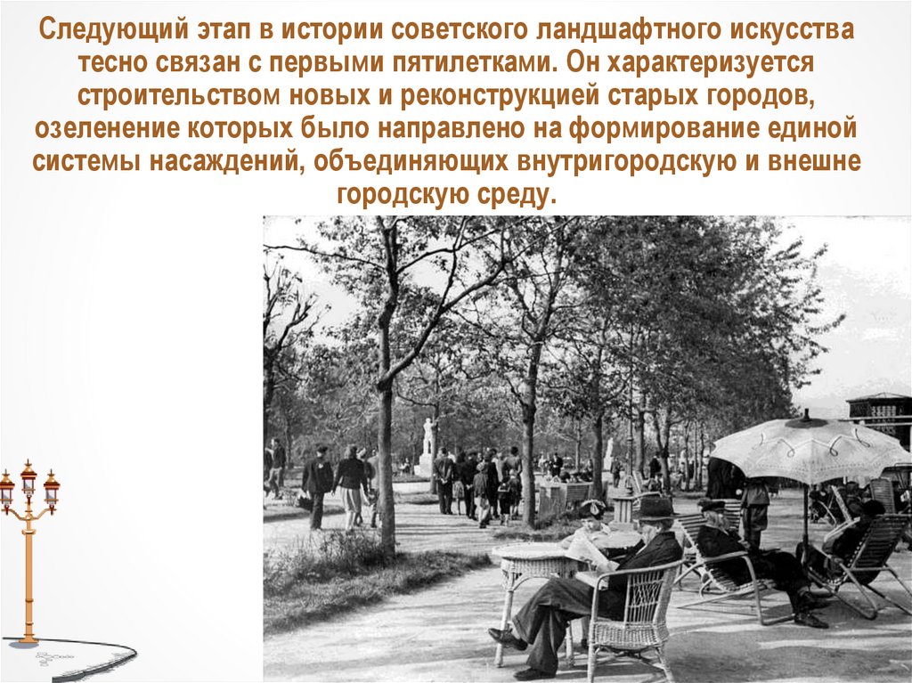 Следующий этап в истории советского ландшафтного искусстватесно связан с первыми пятилетками. Он характеризуется