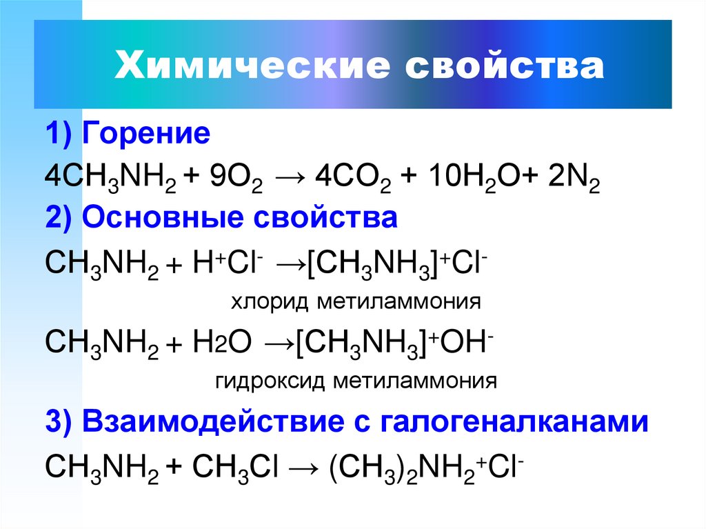 1) Горение4СН3NH2 + 9О2 → 4СО2 + 10Н2О+ 2N2