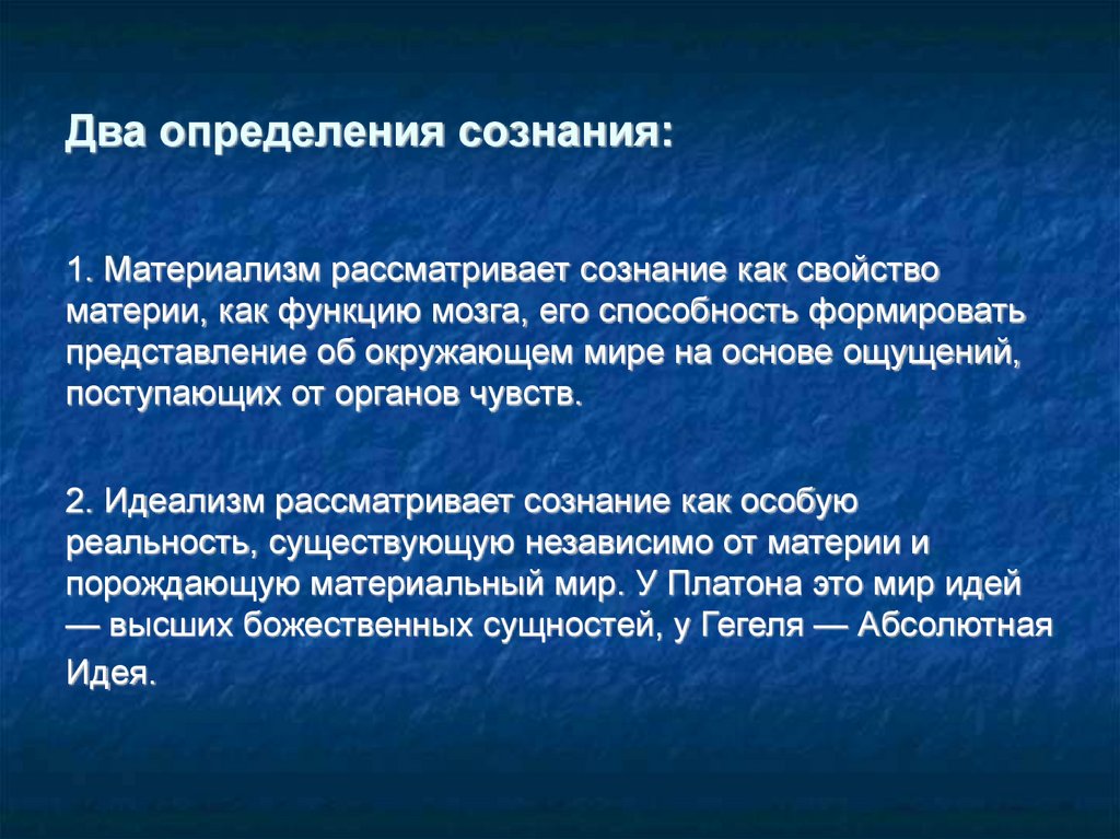 Два определения сознания:1. Материализм рассматривает сознание как свойство