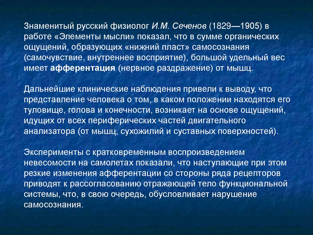 Знаменитый русский физиолог И.М. Сеченов (1829—1905) вработе «Элементы мысли» показал, что в сумме органических