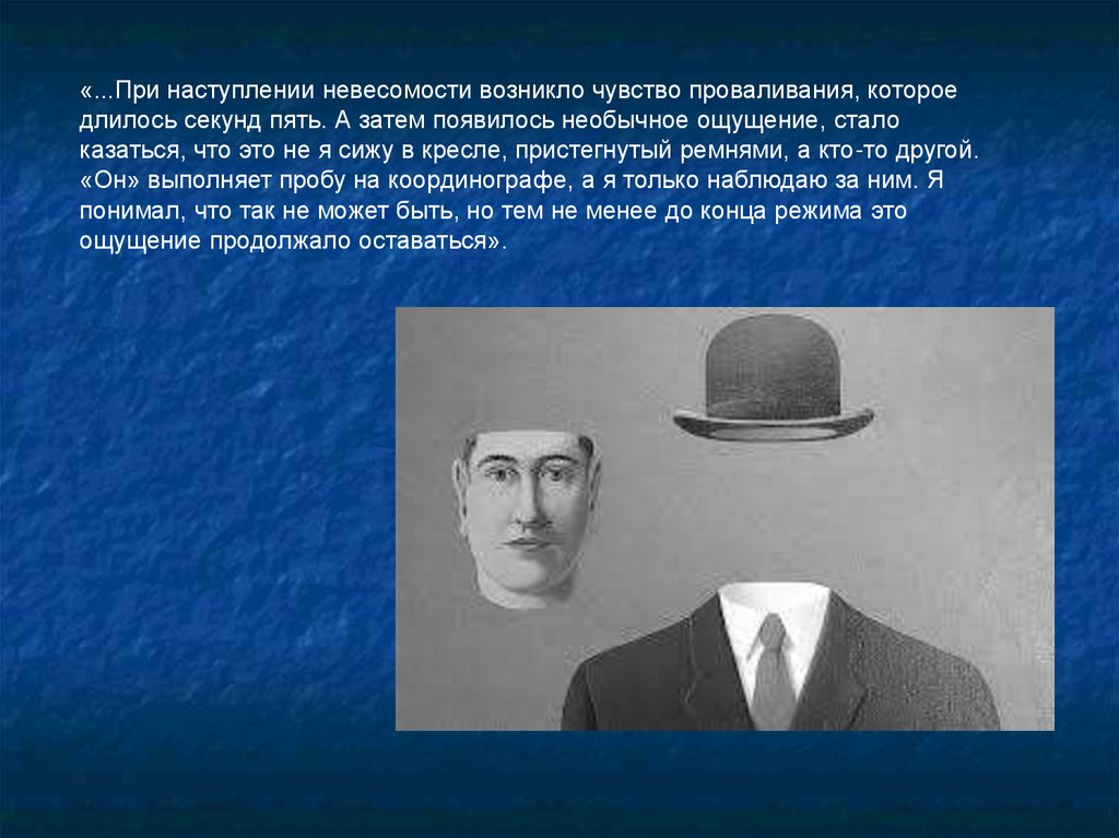 «...При наступлении невесомости возникло чувство проваливания, котороедлилось секунд пять. А затем появилось необычное ощущение, стало