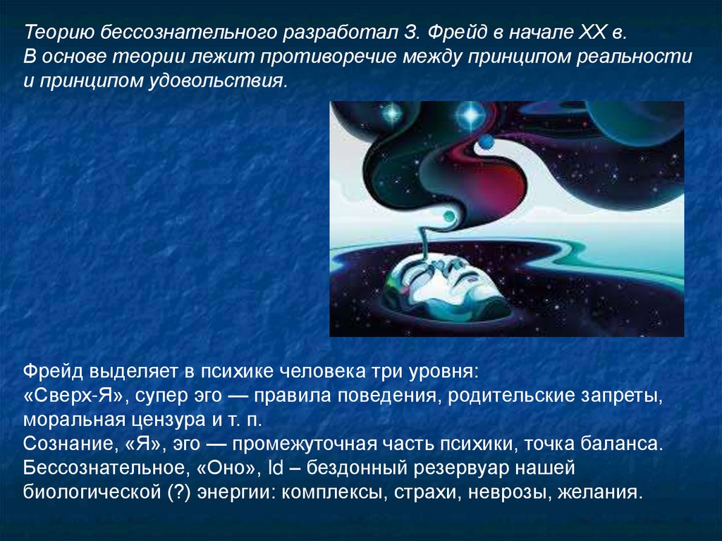 Теорию бессознательного разработал З. Фрейд в начале XX в.В основе теории лежит противоречие между принципом реальности
