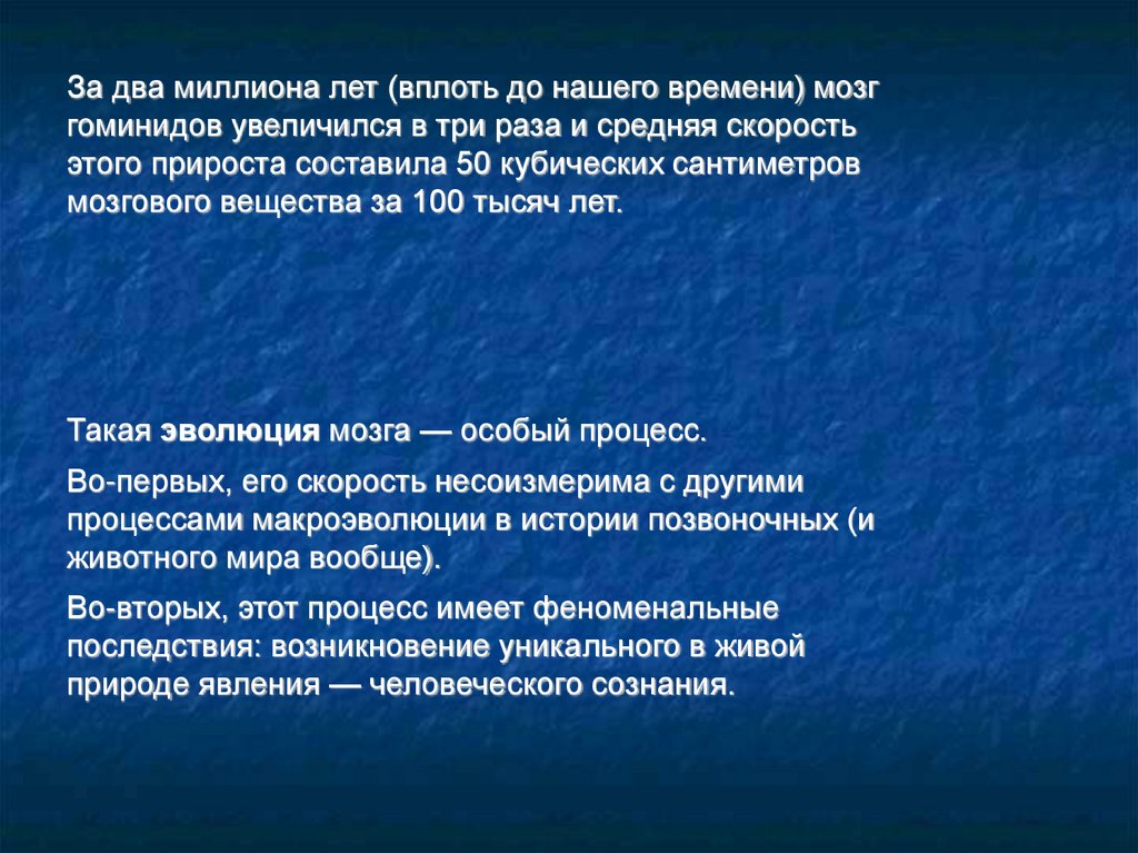 За два миллиона лет (вплоть до нашего времени) мозггоминидов увеличился в три раза и средняя скорость