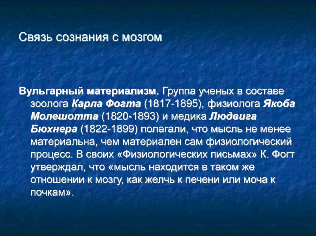 Связь сознания с мозгомВульгарный материализм. Группа ученых в составе