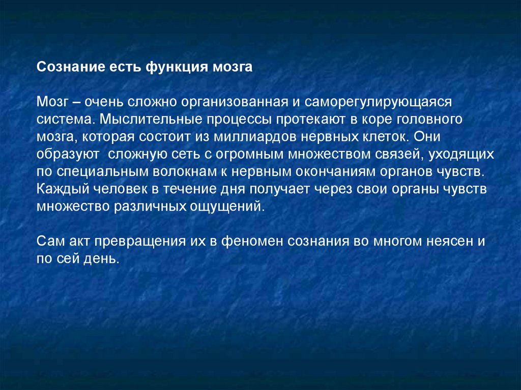 Сознание есть функция мозгаМозг – очень сложно организованная и саморегулирующаяся