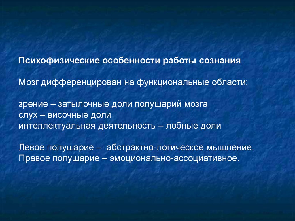 Психофизические особенности работы сознанияМозг дифференцирован на функциональные области: