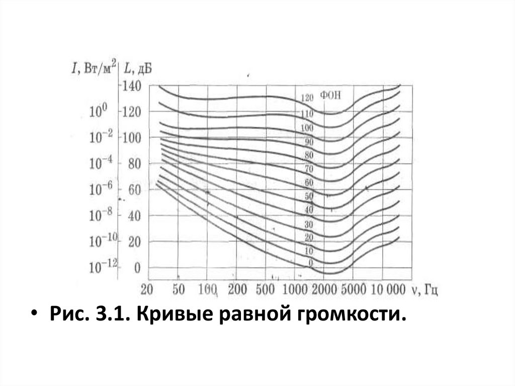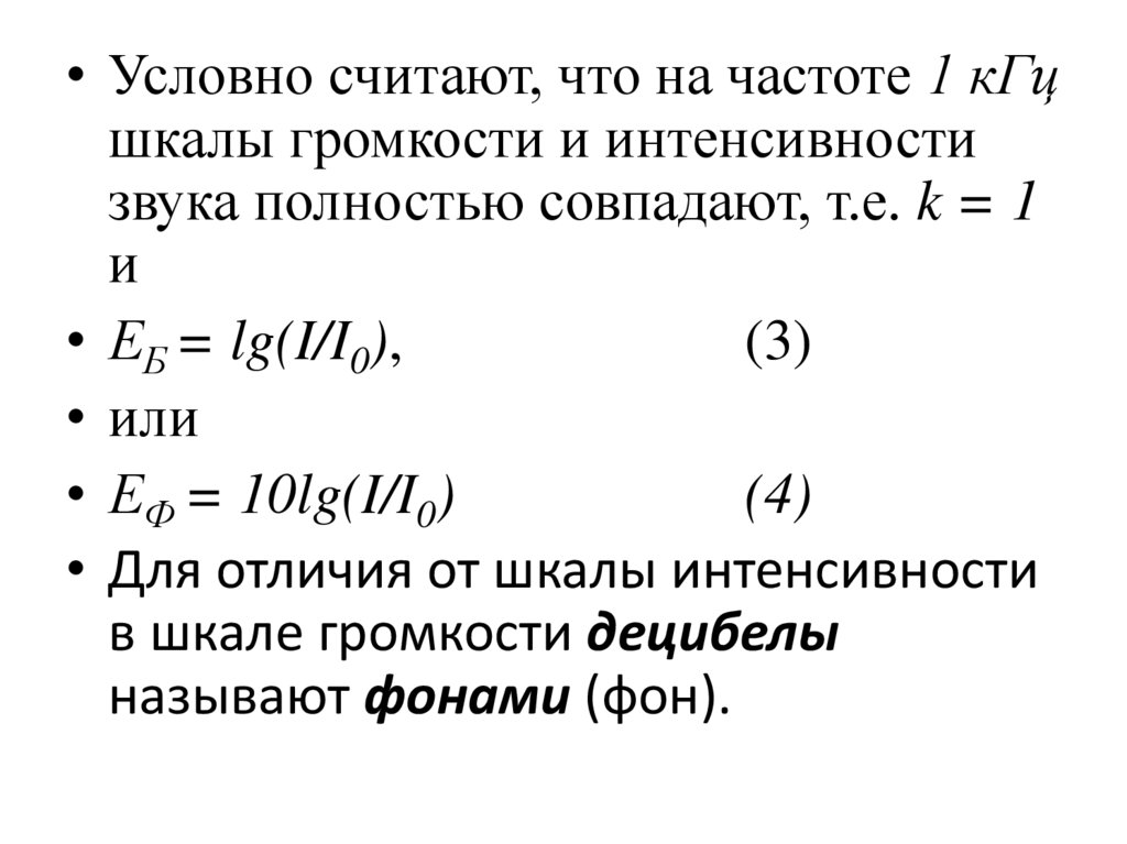 • Условно считают, что на частоте 1 кГцшкалы громкости и интенсивности