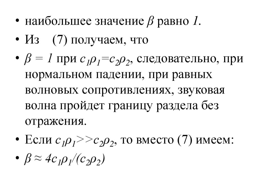 • β = 1 при с1ρ1=с2ρ2, следовательно, при